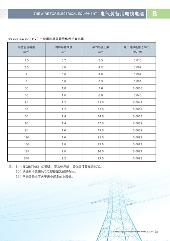 額定電壓450/750V及以下聚氯乙烯絕緣電線電纜型號、名稱和執(zhí)行標準型號名稱額定電壓(V)執(zhí)行標準227 IEC 01 (BV)一般用途單芯硬導體無護套電纜450/750GB 5023227 IEC 02 (RV)一般用途單芯軟導體無護套電纜450/750GB 5023227 IEC 05 (BV)內(nèi)部布線用導體溫度為70℃單芯實心導體無護套電纜300/500GB 5023227 IEC 06